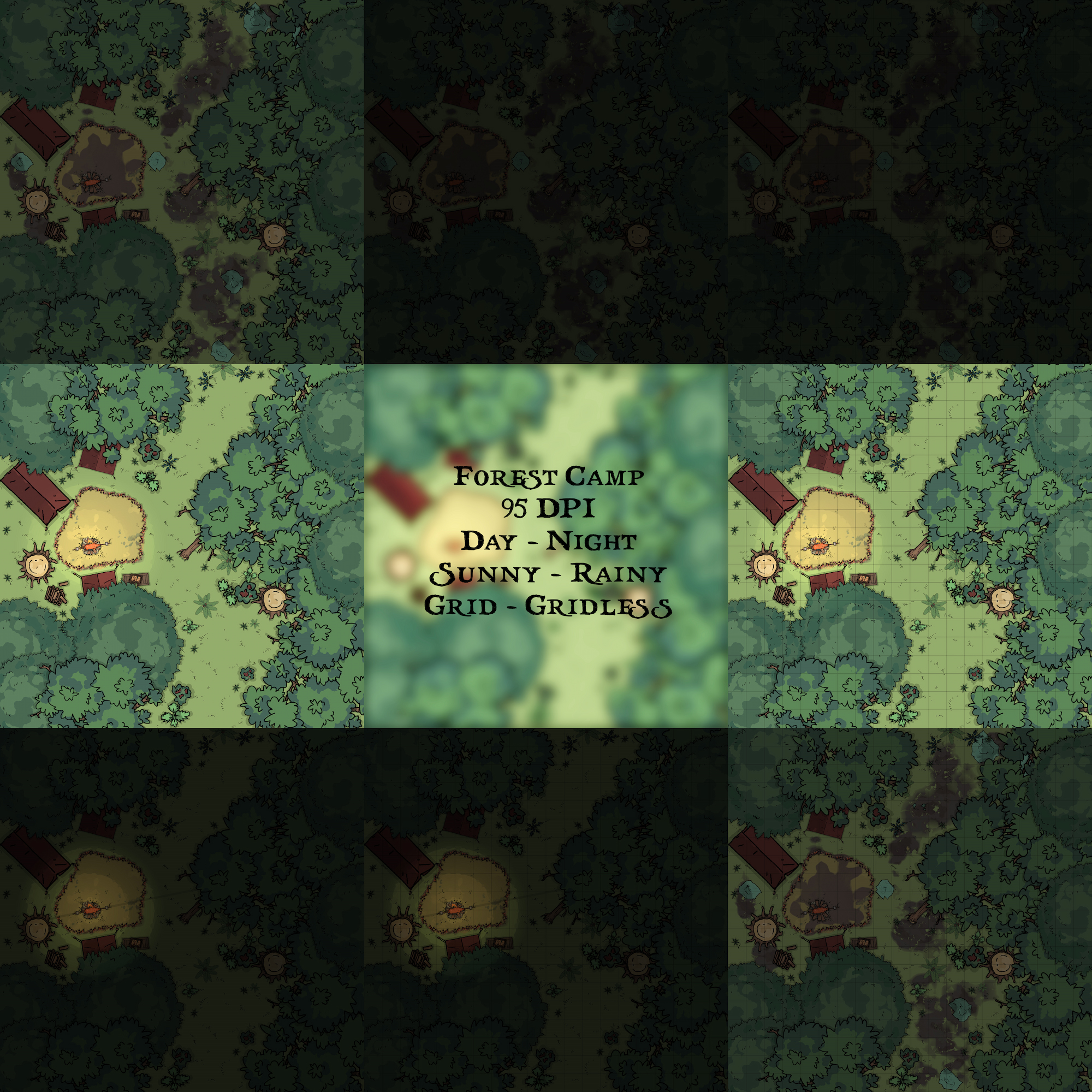 This is a battlemap pack. The pack contains 8 battlemap versions of a forest camp. The versions are: Gridded, Gridless, Day, Night, Rainy, Sunny. The gridless and grided version allows for people to print it themselves and use it on irl sessions, but also makes it possible for vtt import, allowing game masters to import and set up their own grid on the gridless version, allowing everyone to use it regardless of the place where they host the session.